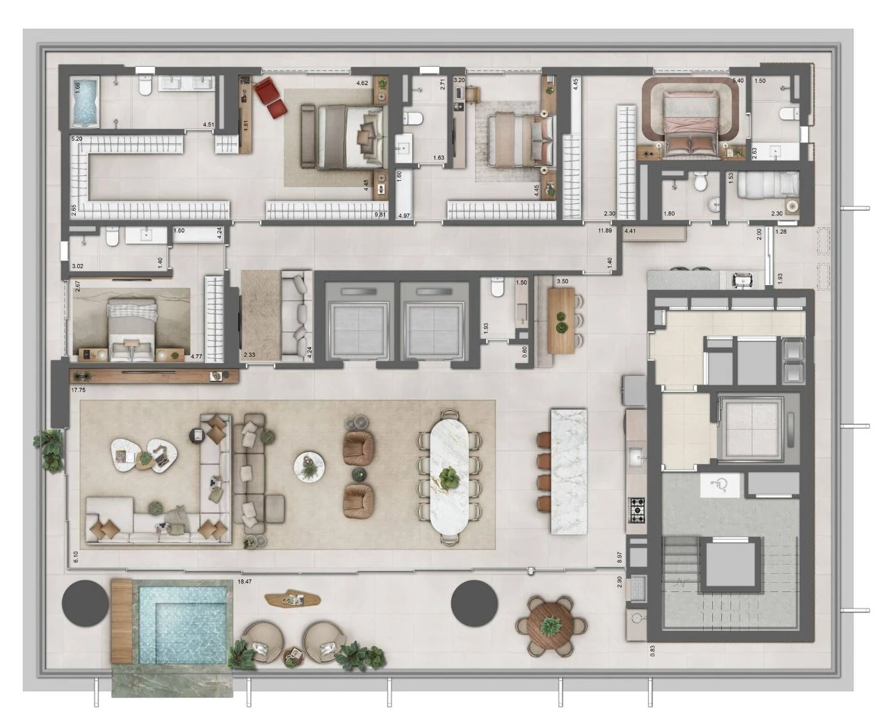 Um apartamento por andar, varanda gourmet e piscina privativa, assinatura do projeto é do escritório Perkins & Will, parceria inédita com a Lacoste.
