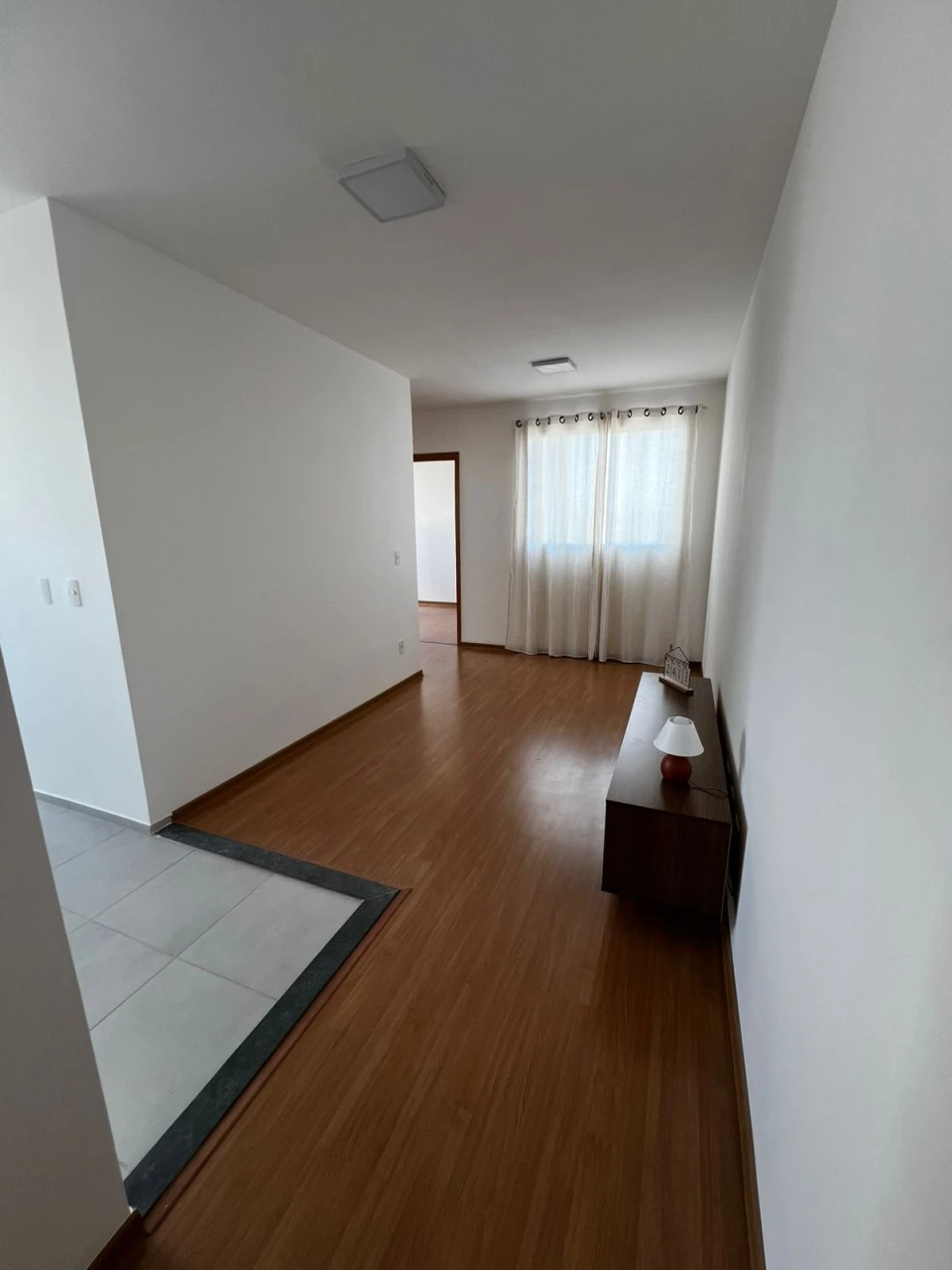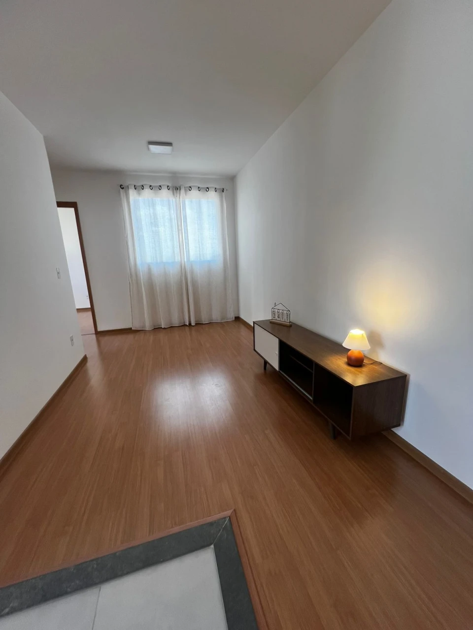 Imóvel nunca habitado, gabinete no banheiro e box com chuveiro, rack na sala com decoração.