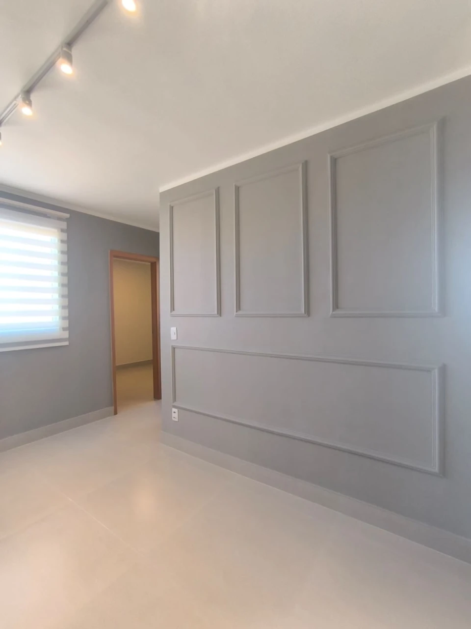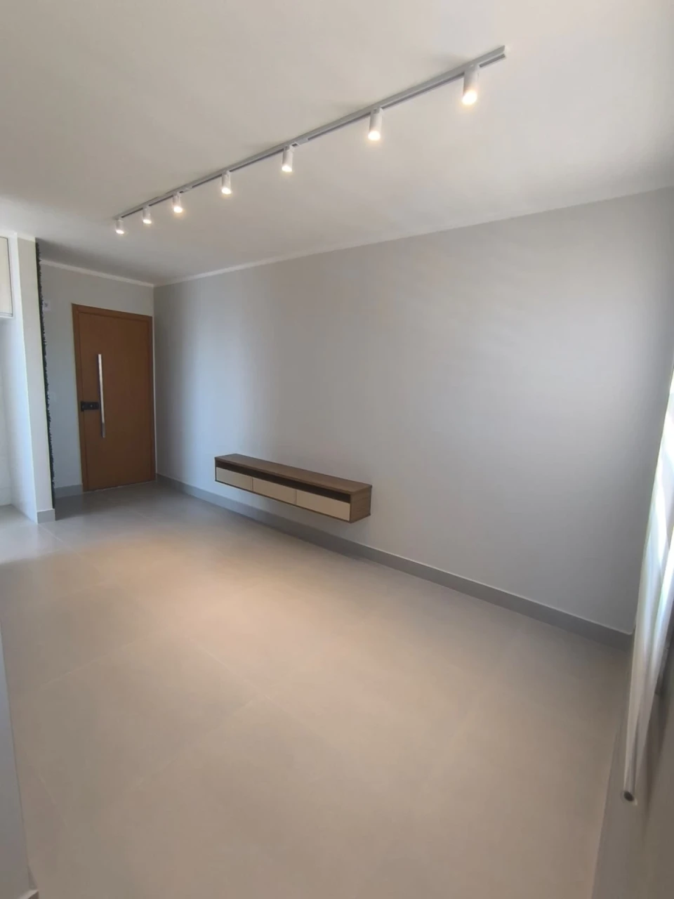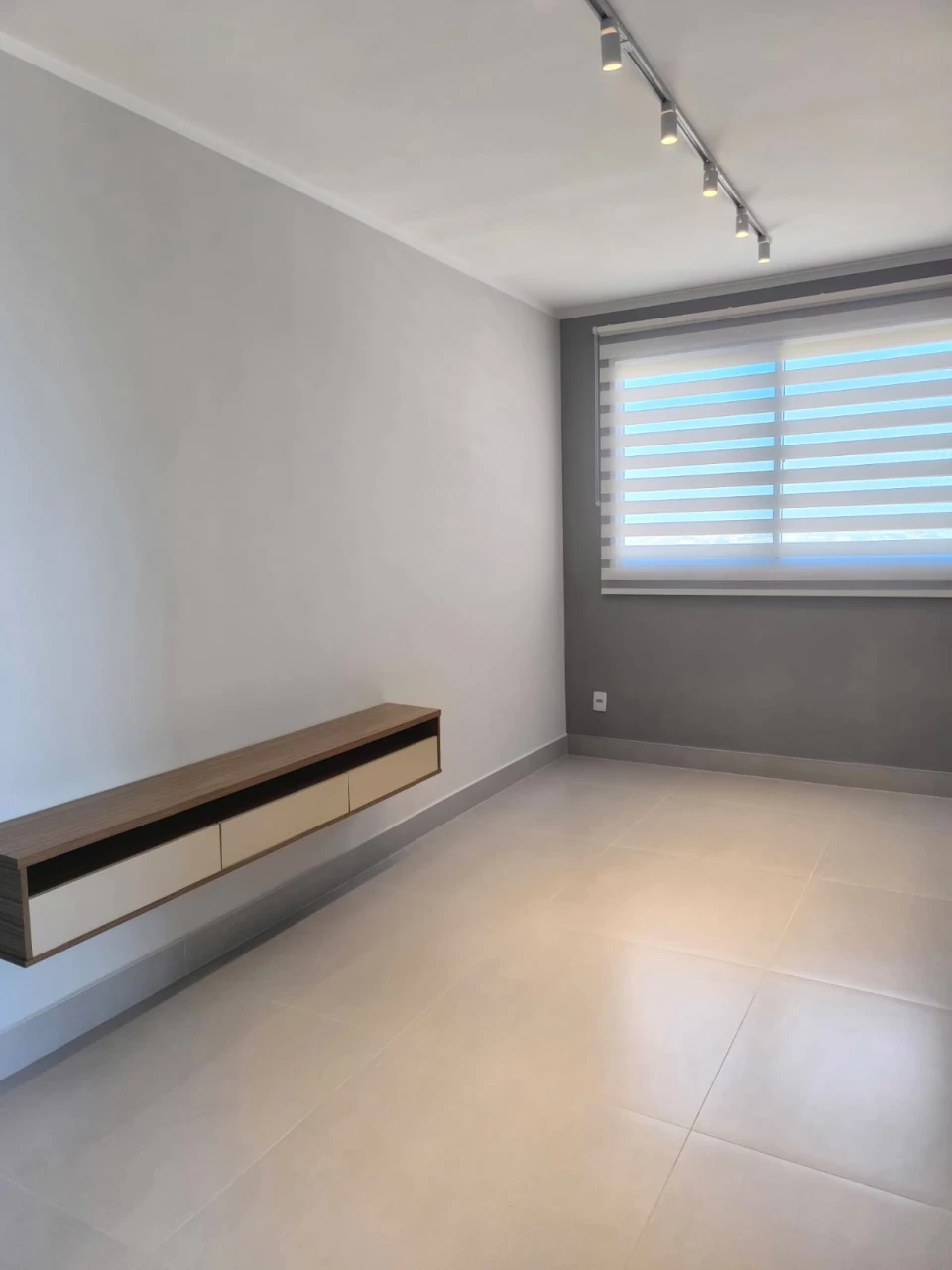 Possui fechadura eletrônica, painel para TV na sala, cozinha com armários, espelho e cortina dual vision