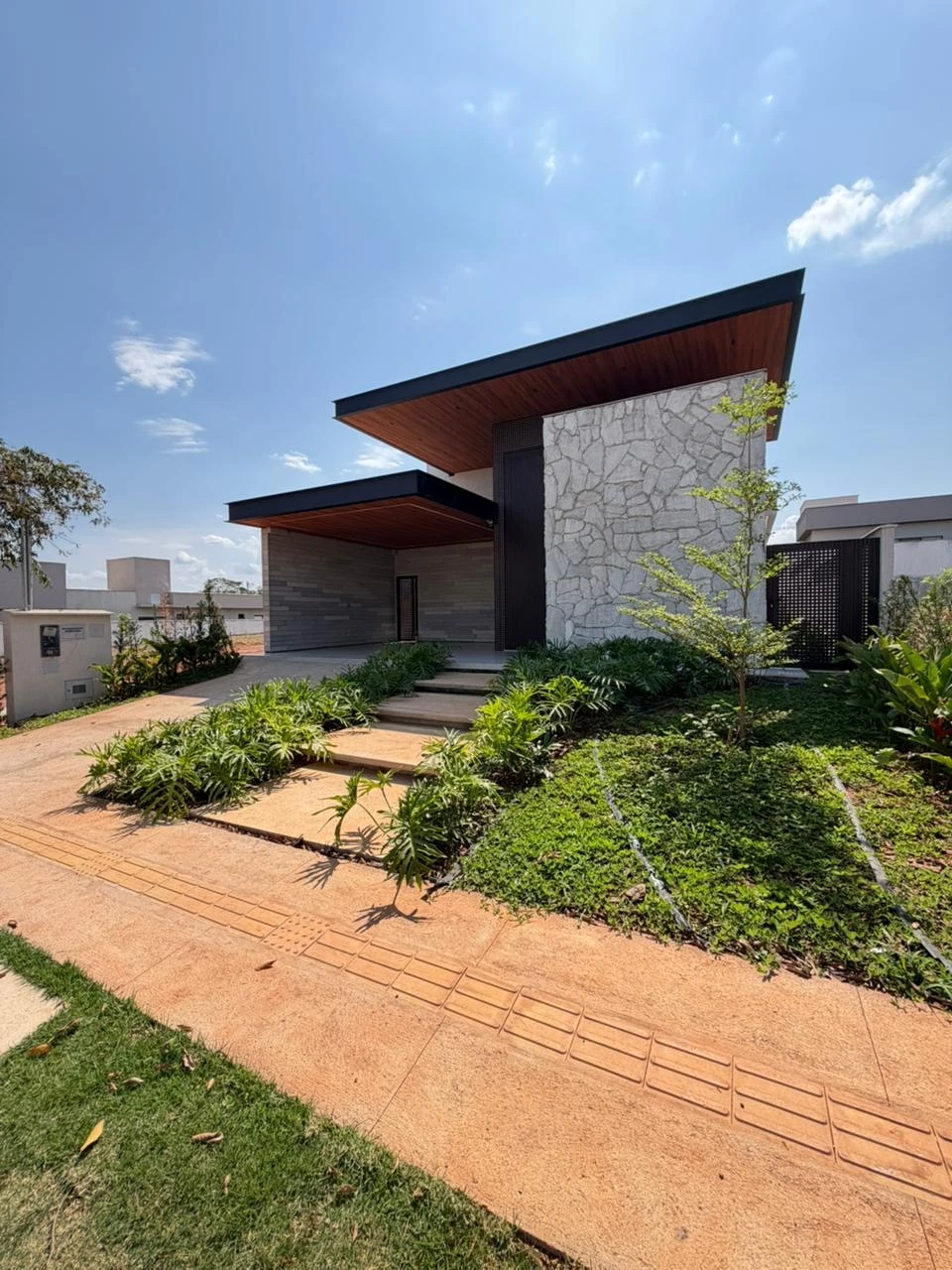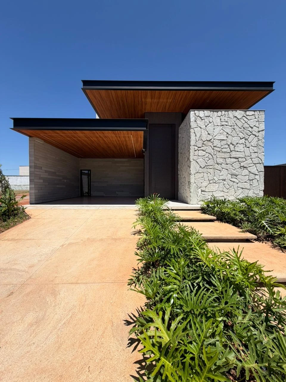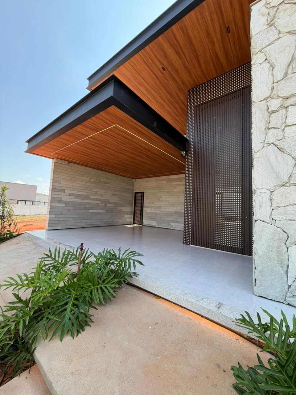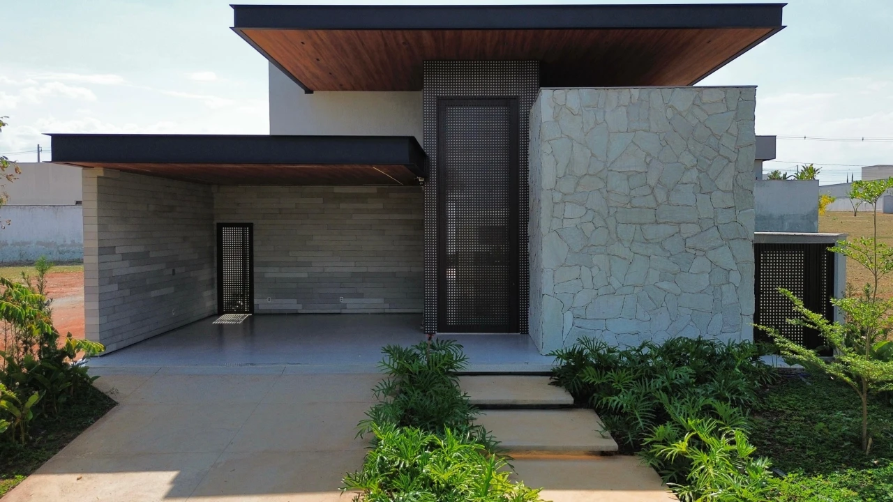 - Destaques: • Fachada imponente em pedra natural Escandinávia, forro Vinilico amadeirado, estrutura em viga metálica maciça e esquadrias em Muxarabi Concept • 4 suítes • lavabo externo • lavanderia • Suíte master com closet, varanda privativa e banheiro com duas duchas de teto • Ambientes integrados: sala, cozinha e gourmet com excelente iluminação natural • Bancadas em quartzo Biancato Valentino e revestimentos em travertino natural. • Piscina com hidromassagem, iluminação subaquática e deck em madeira Sucupira juntamente com um chuveirão em Angelim vermelho • Churrasqueira parrilla automatizada e som Bluetooth embutido na área gourmet • Paisagismo completo com irrigação semi-automática e iluminação cênica • 06 Redes de ar condicionado • Ponto para carro elétrico, sistema de água quente e infraestrutura para aquecimento da piscina via trocador de calor.