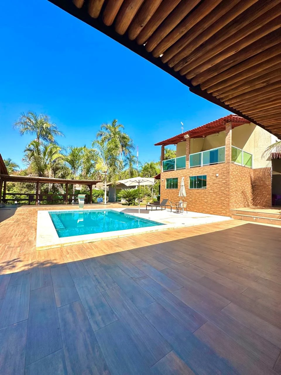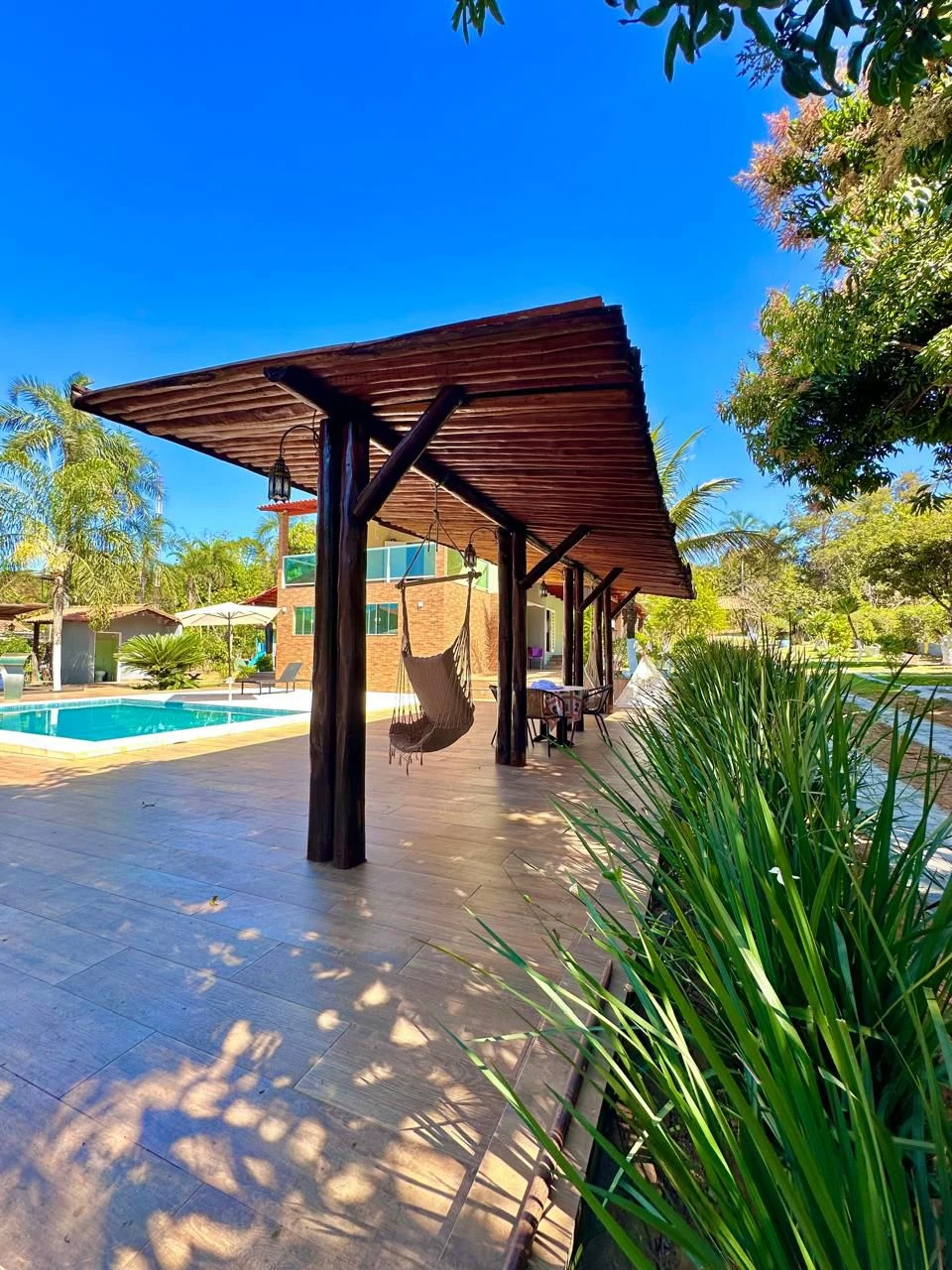 - Área Interna da sede: - Dispõe de (06) quartos sendo: - (02) suítes com cama de casal e uma solteiro com outra cama acoplada - (04) quartos com uma cama casal cada e uma cama solteiro em cada um; - Uma sala ampla com sofá, tv e banheiro social; - Sacada com vista para a piscina contendo redes e sofás para apreciar a vista. - A cozinha da sede está toda rica em armários, assim como a cozinha da área da churrasqueira.