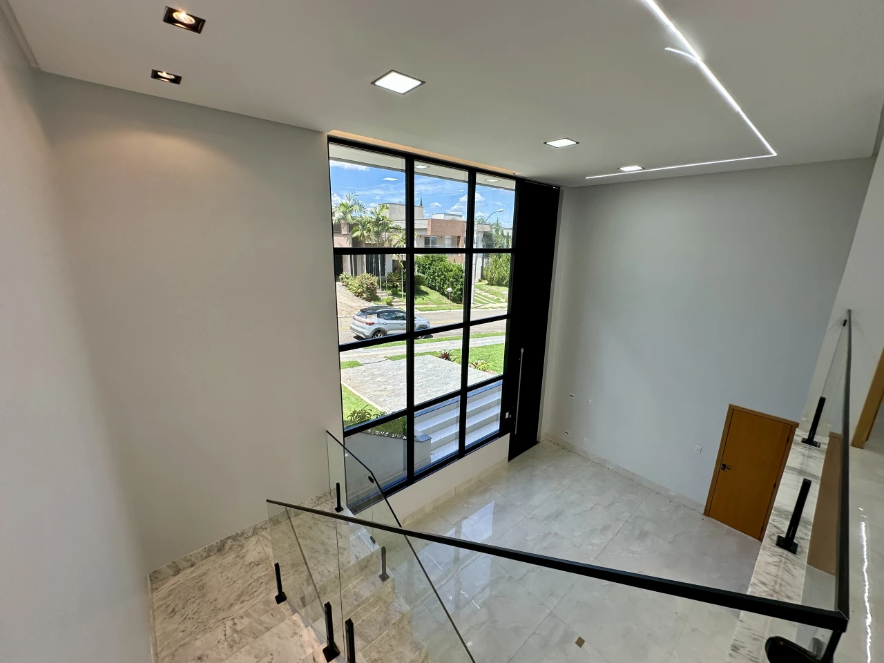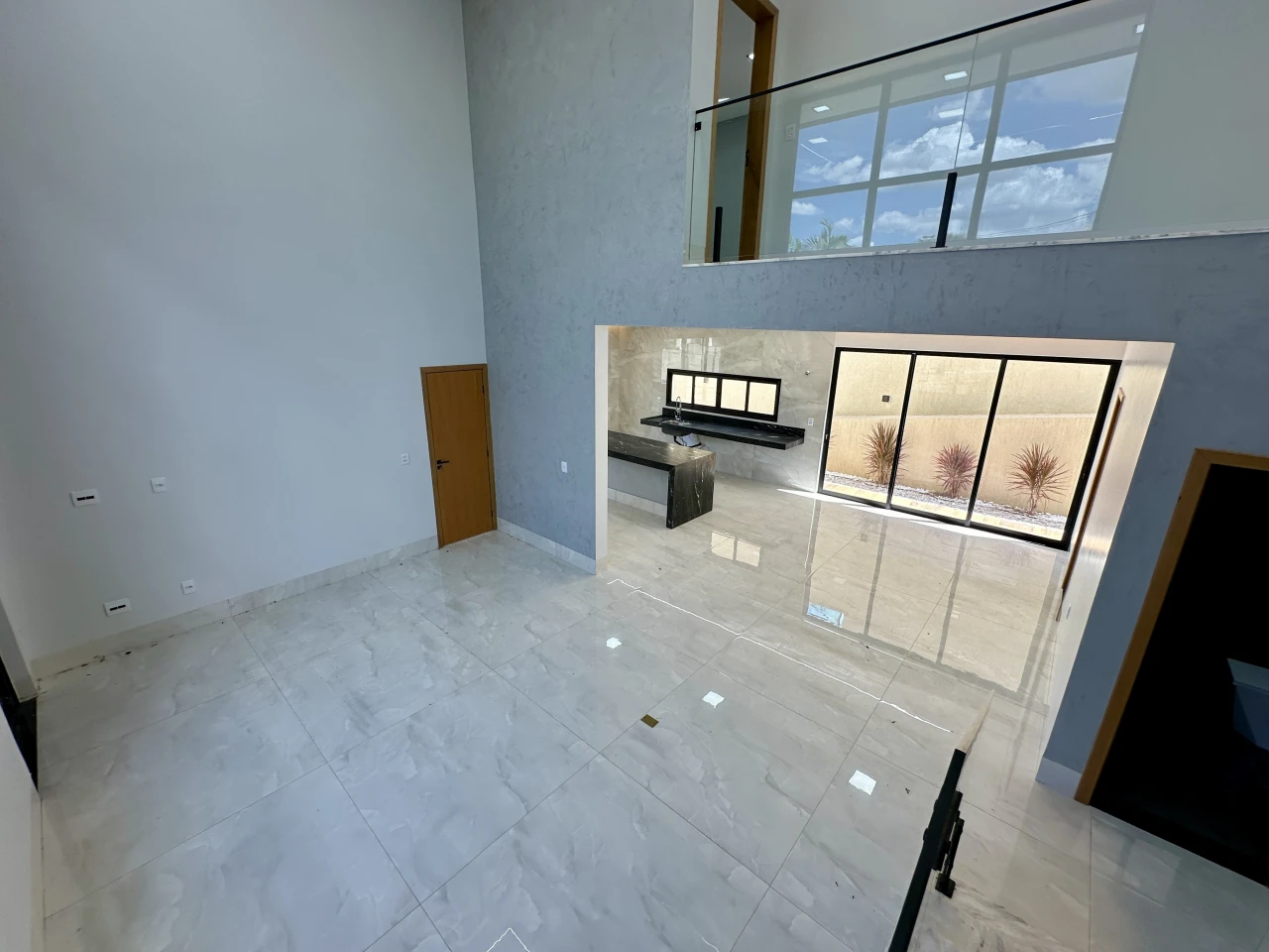 Sala com living e pé direito alto, cozinha integrada a sala, área de lazer completa piscina aquecida, com hidro, led e cascata