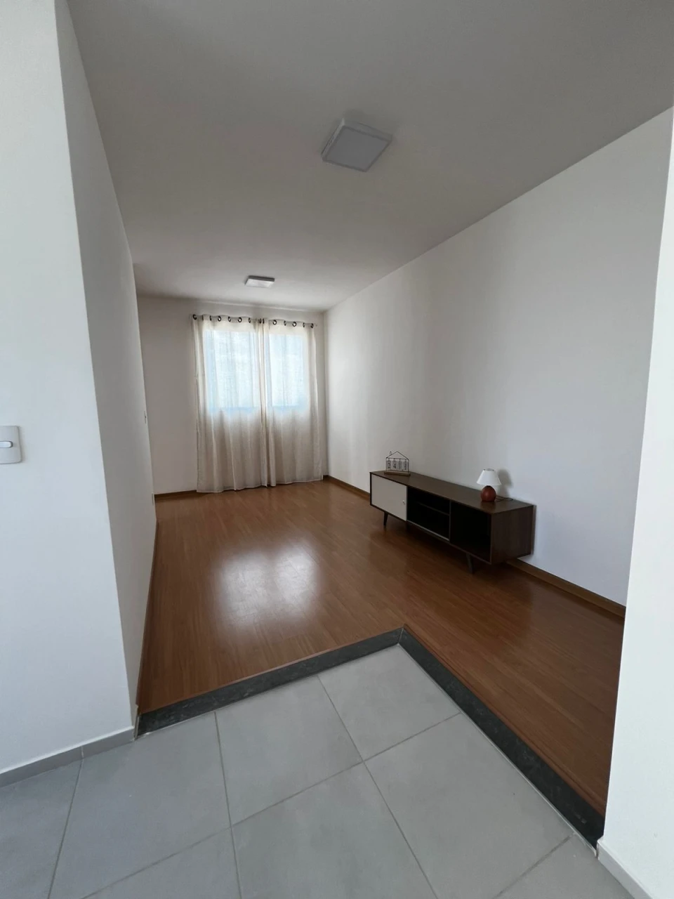 Imóvel nunca habitado, gabinete no banheiro e box com chuveiro, rack na sala com decoração.