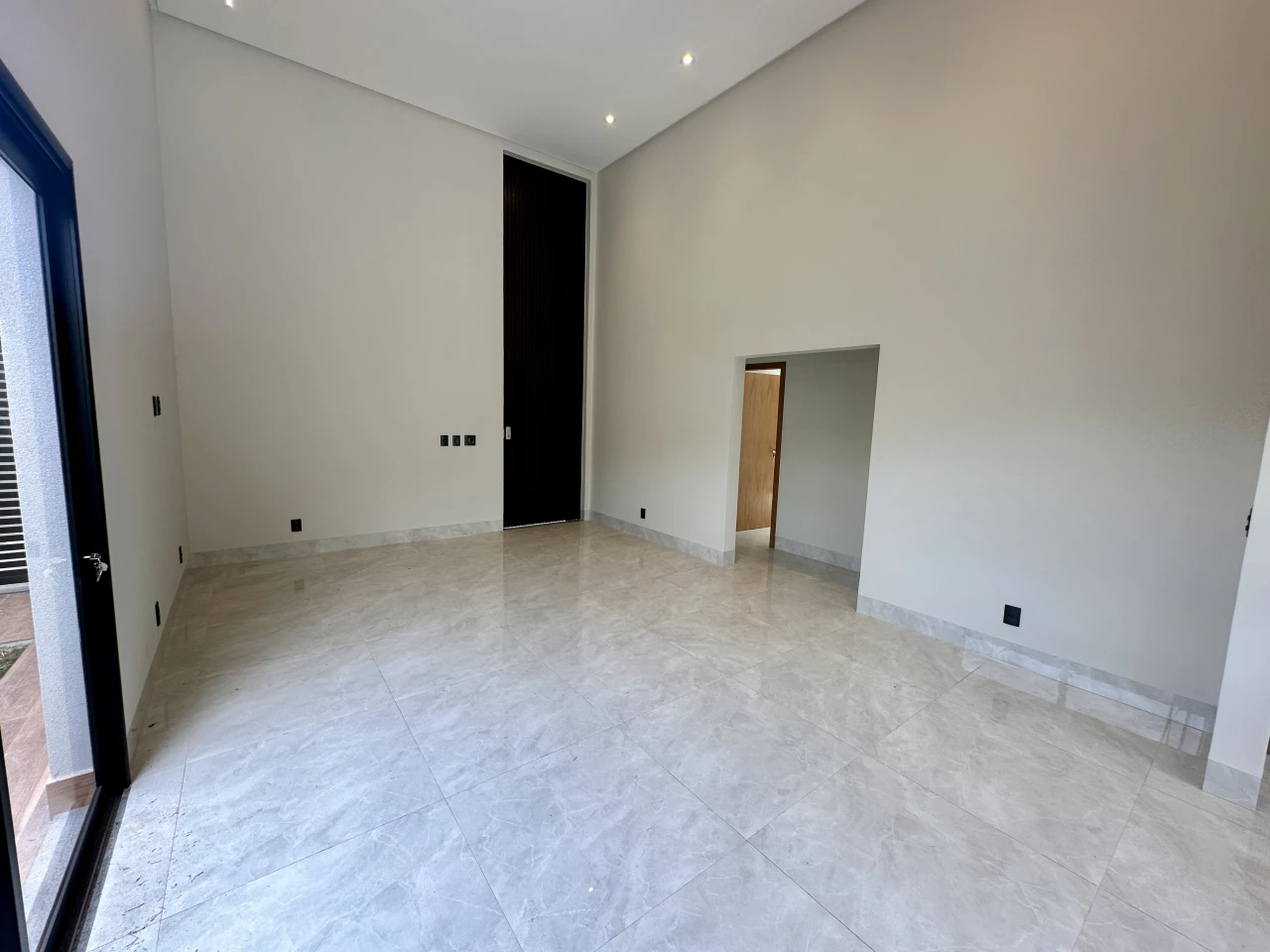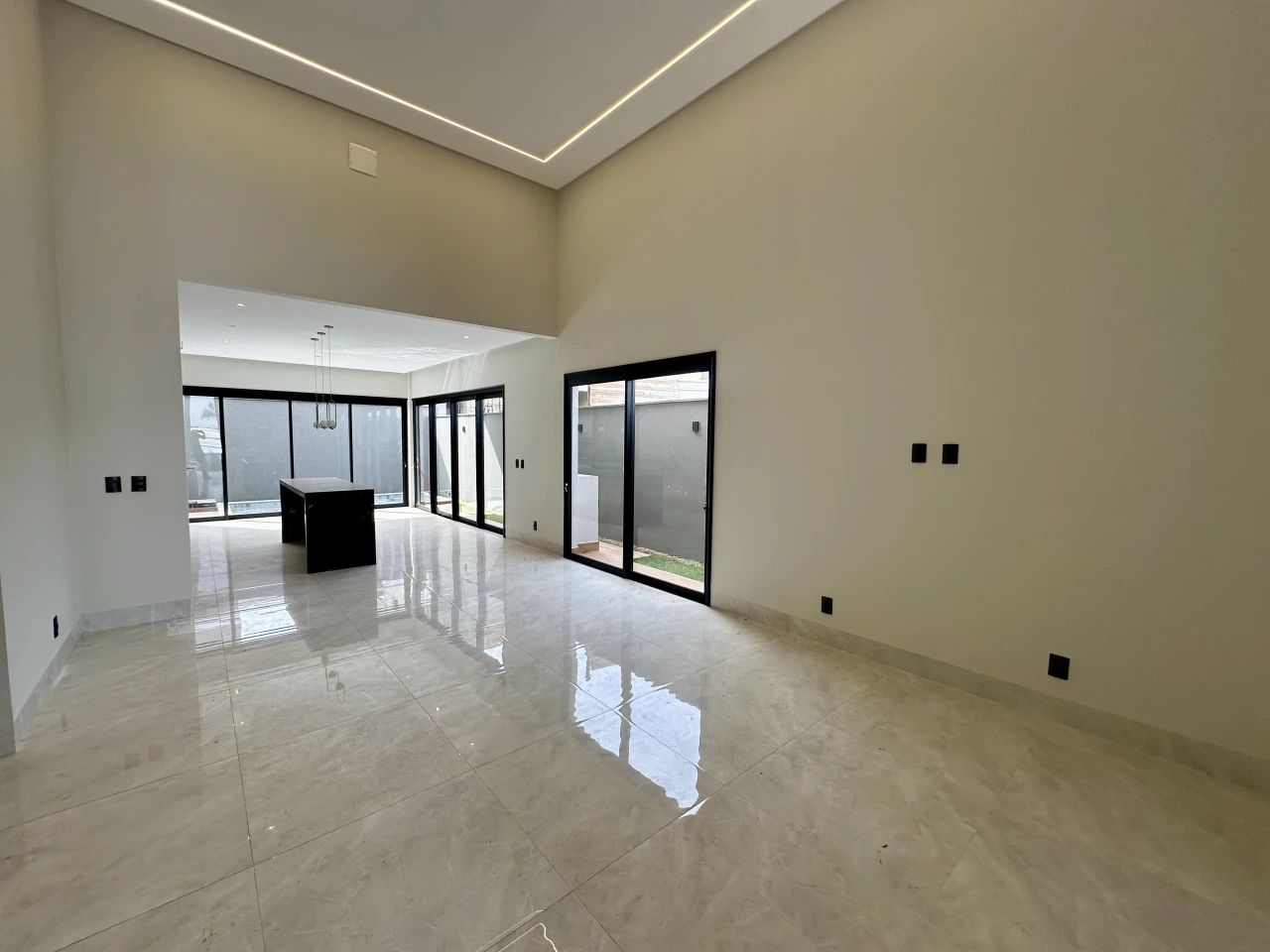 Sala com pé direito duplo, cozinha integrada com sala, piscina