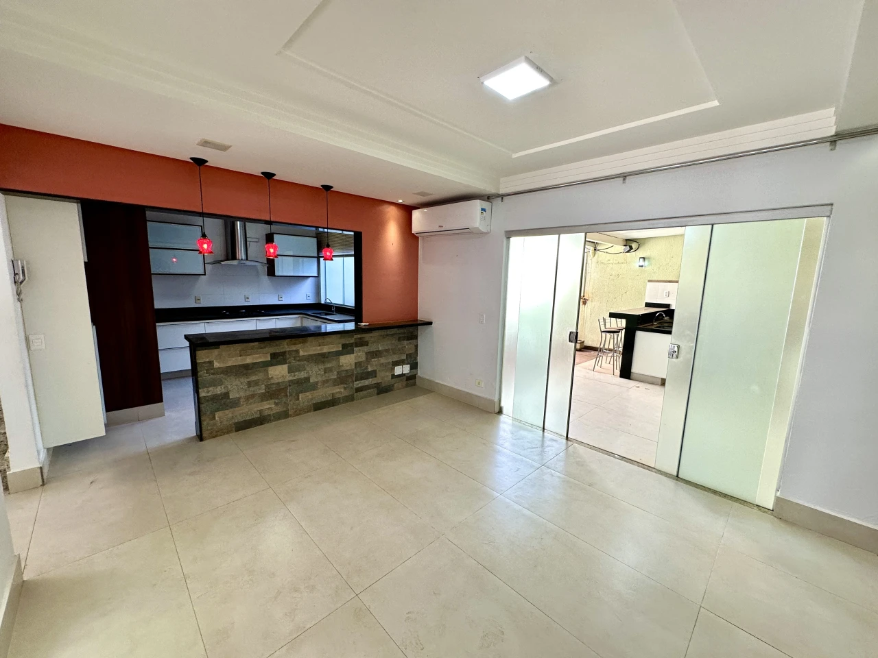Sala de jantar com ar condicionado, lavabo, cozinha americana repleta em armários, varanda gourmet com churrasqueira a carvão