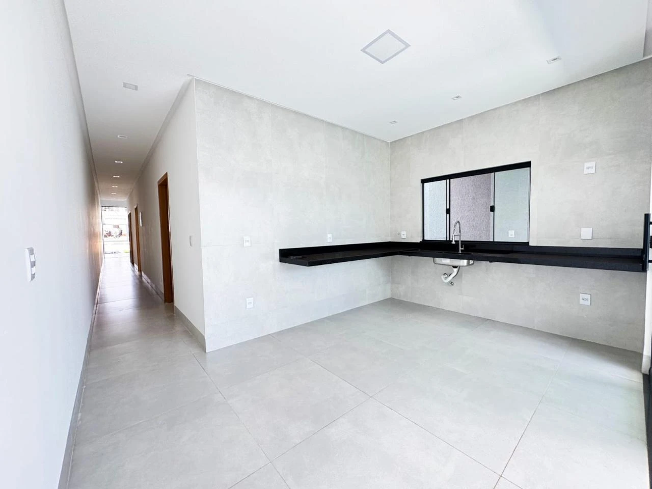 Sala com pé direito duplo, piscina com hidromassagem e cascata, área gourmet, nichos nos banheiros, toda no porcelanato.
