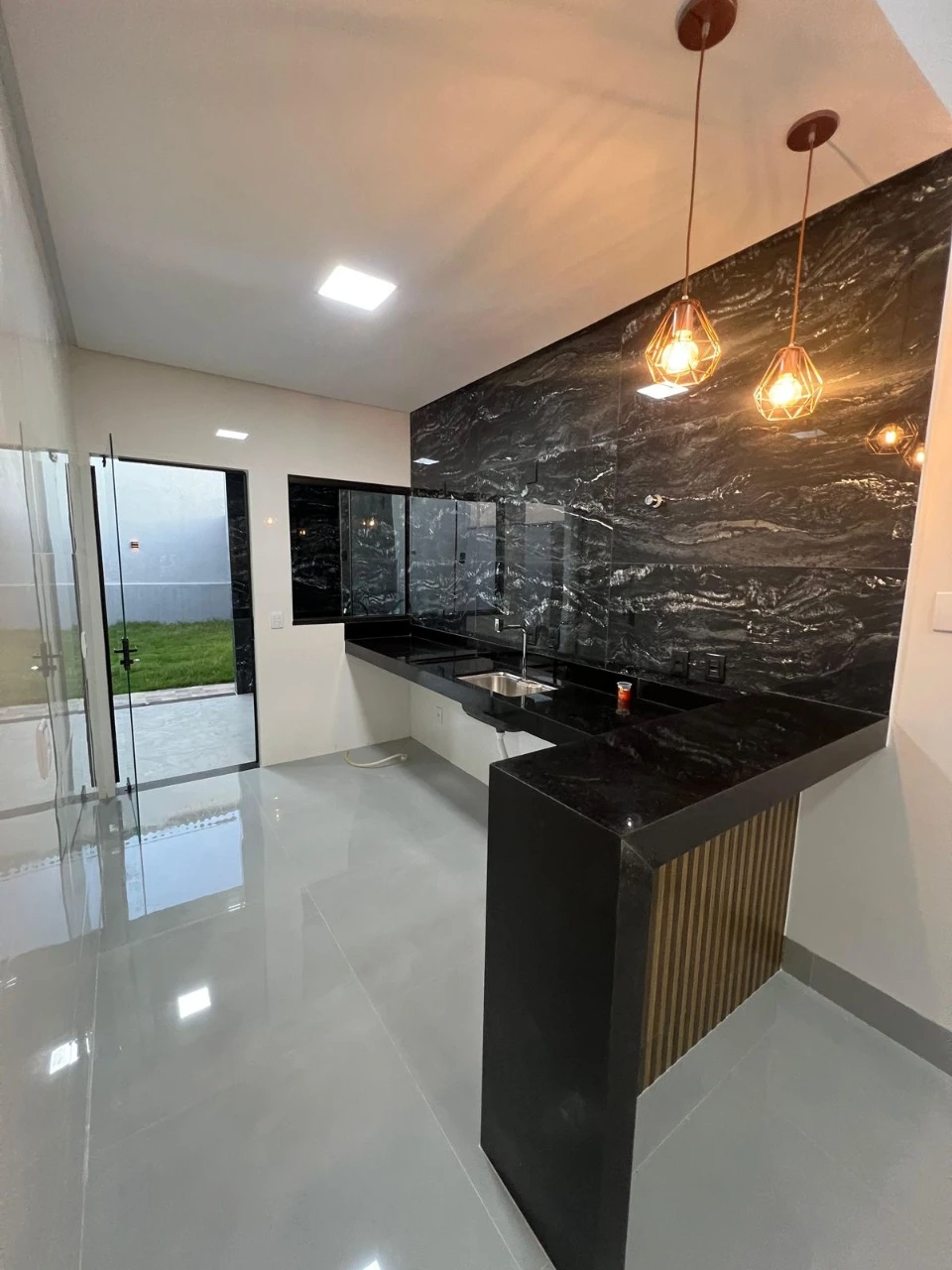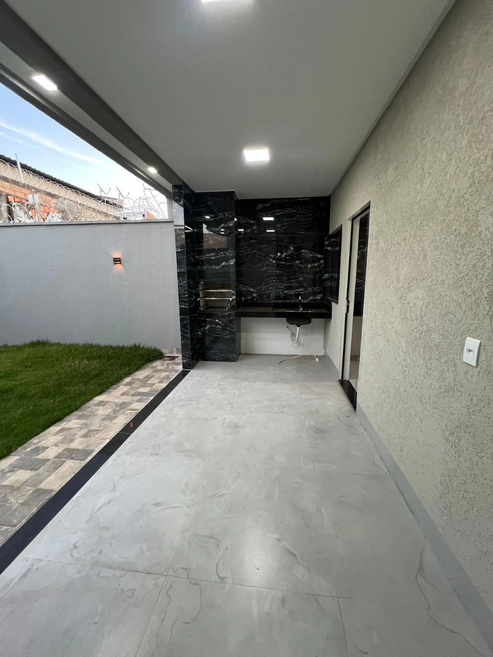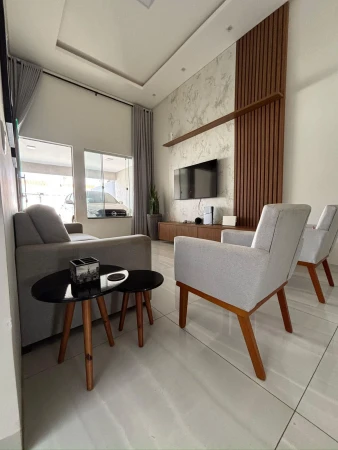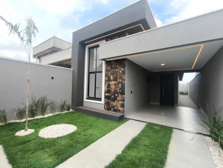 - Diferenciais: Casa com pé direito alto, Fachada em pedras decorativas, Corredor lateral, Projeto de iluminação, Sala com dois ambientes integrados, Cozinha com bancadas em Mármore, Área Gourmet separada com churrasqueira e um quintal bem grande.